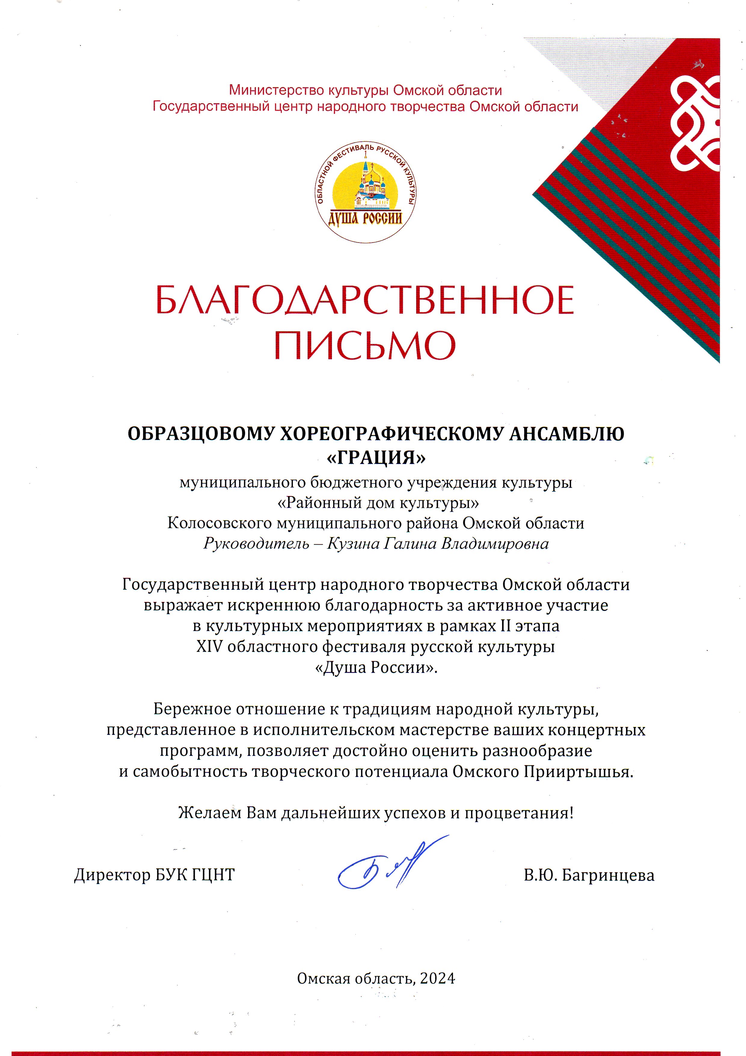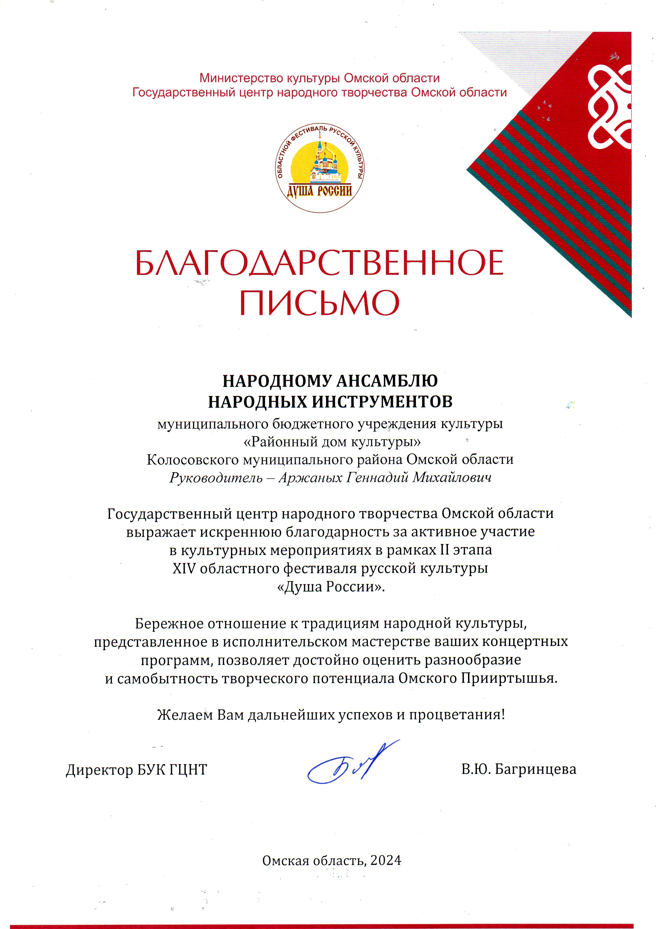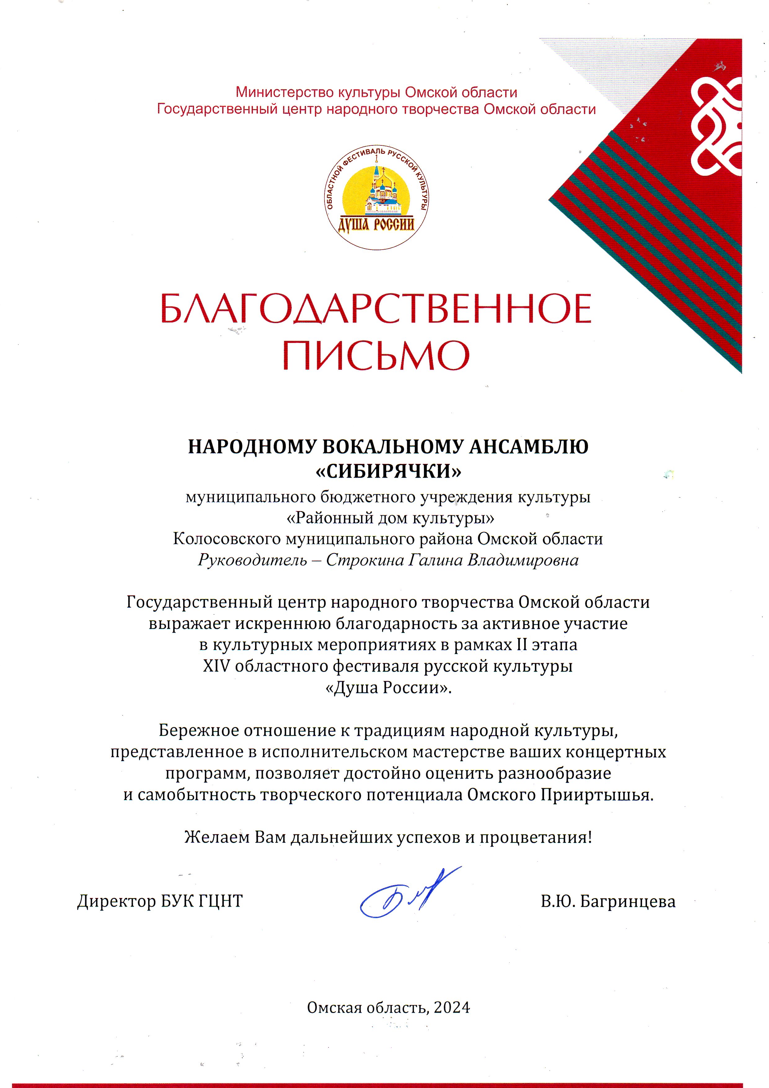 27 октября в г. Тара состоялась заключительная программа второго этапа 14 областного фестиваля русской культуры «Душа России». Тарская сцена собрала артистов из Большеуковского, Большереченского, Знаменского, Колосовского, Нижнеомского, Саргатского, Исилькульского, Тарского и Усть-Ишимского муниципальных районов. Колосовский район в гала-концерте представляли народный ансамбль «Сибирячки» (рук. Галина Строкина), народный ансамбль народных инструментов под руководством Геннадия Аржаных и образцовый хореографический ансамбль «Грация» (рук.Галина Кузина). Выступления наших артистов вызвали бурю оваций и возгласы «Браво». Мы поздравляем участников фестиваля с успешным выступлением. Благодарим Тарский муниципальный район , КДЦ "Север" и Надежду Борисовну Котелкину за гостеприимство.
