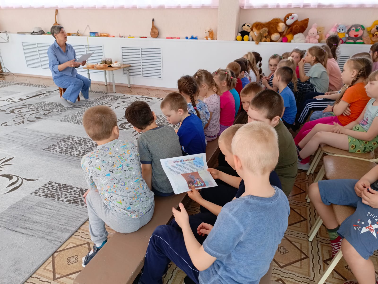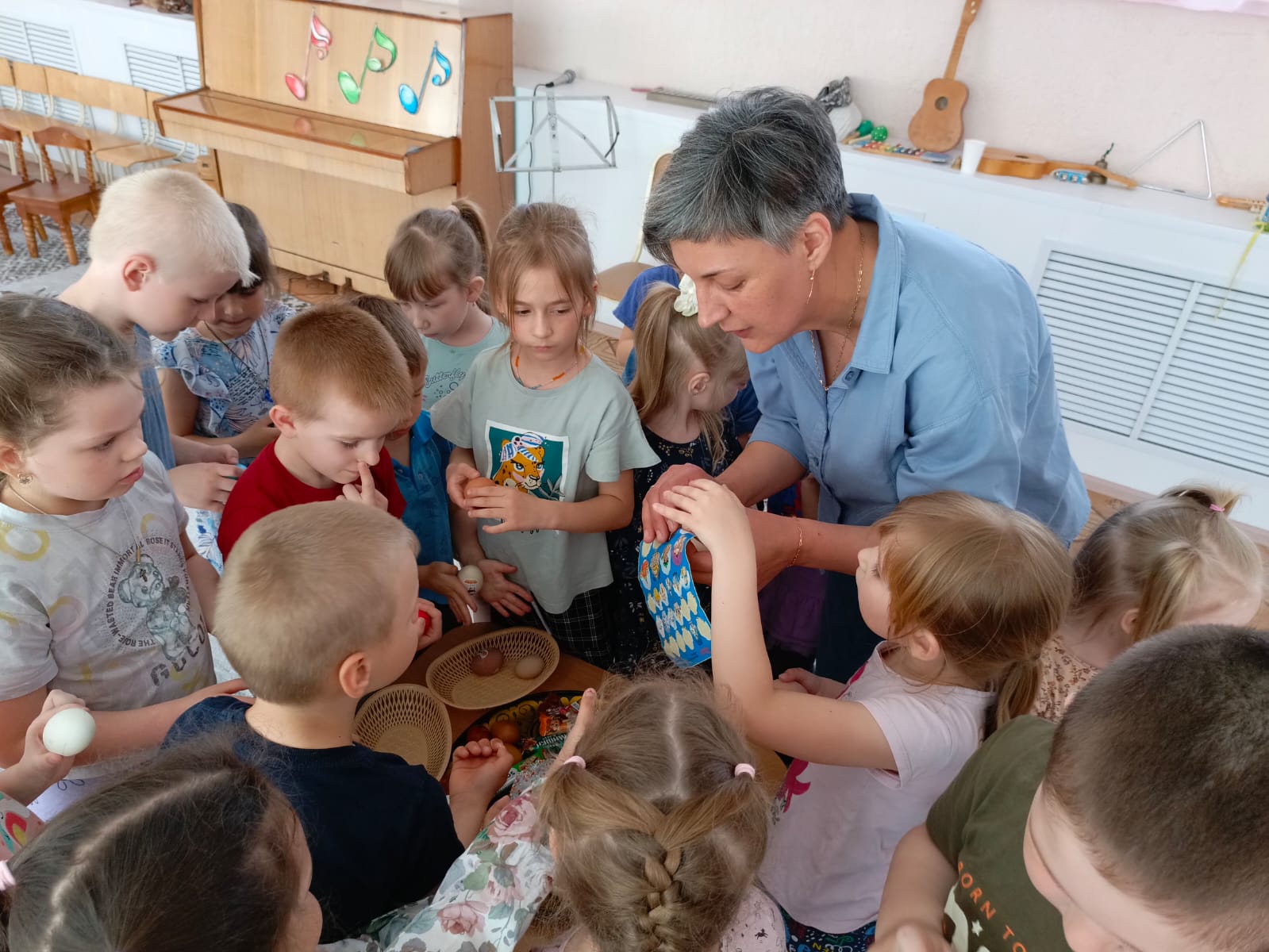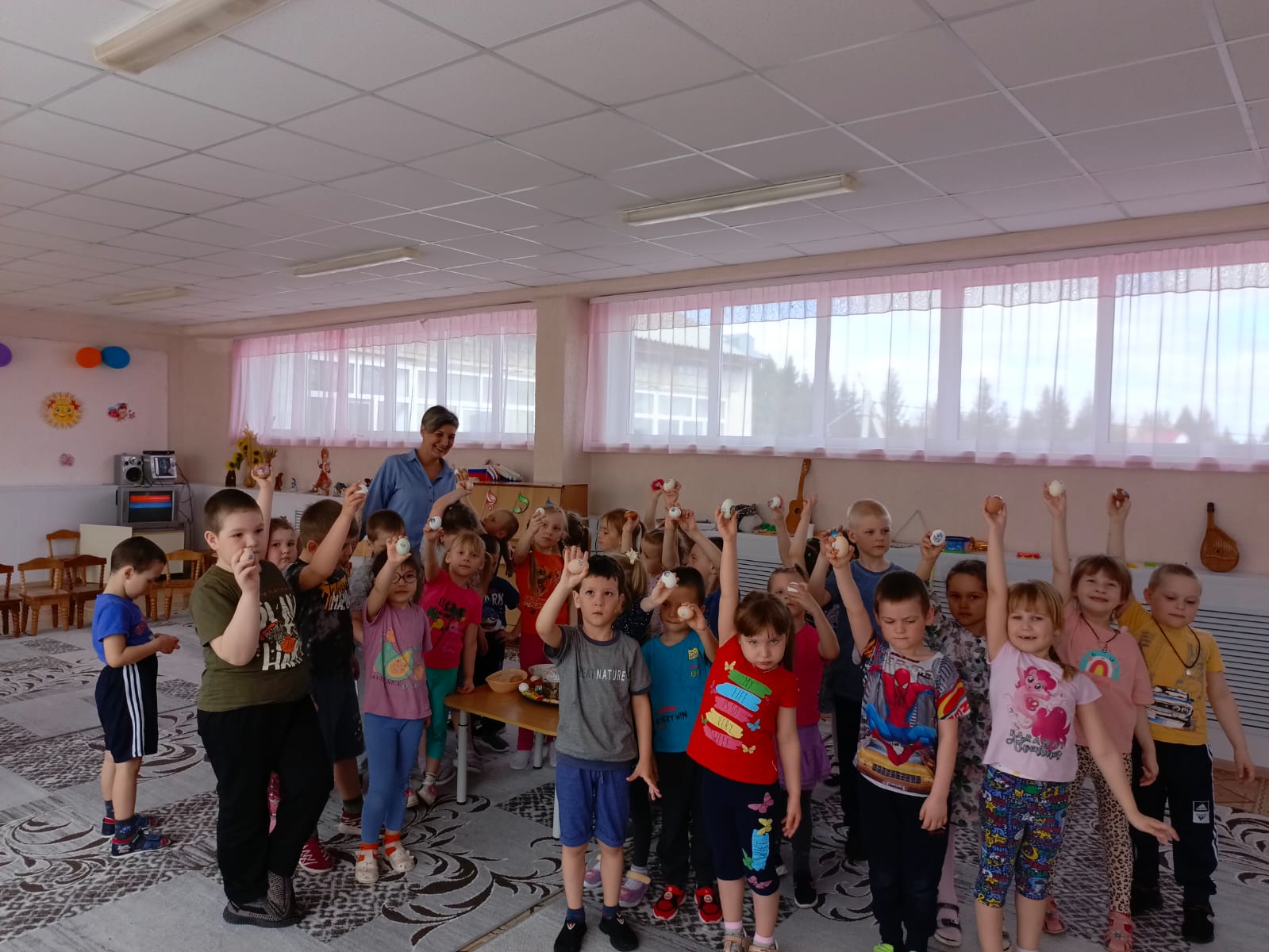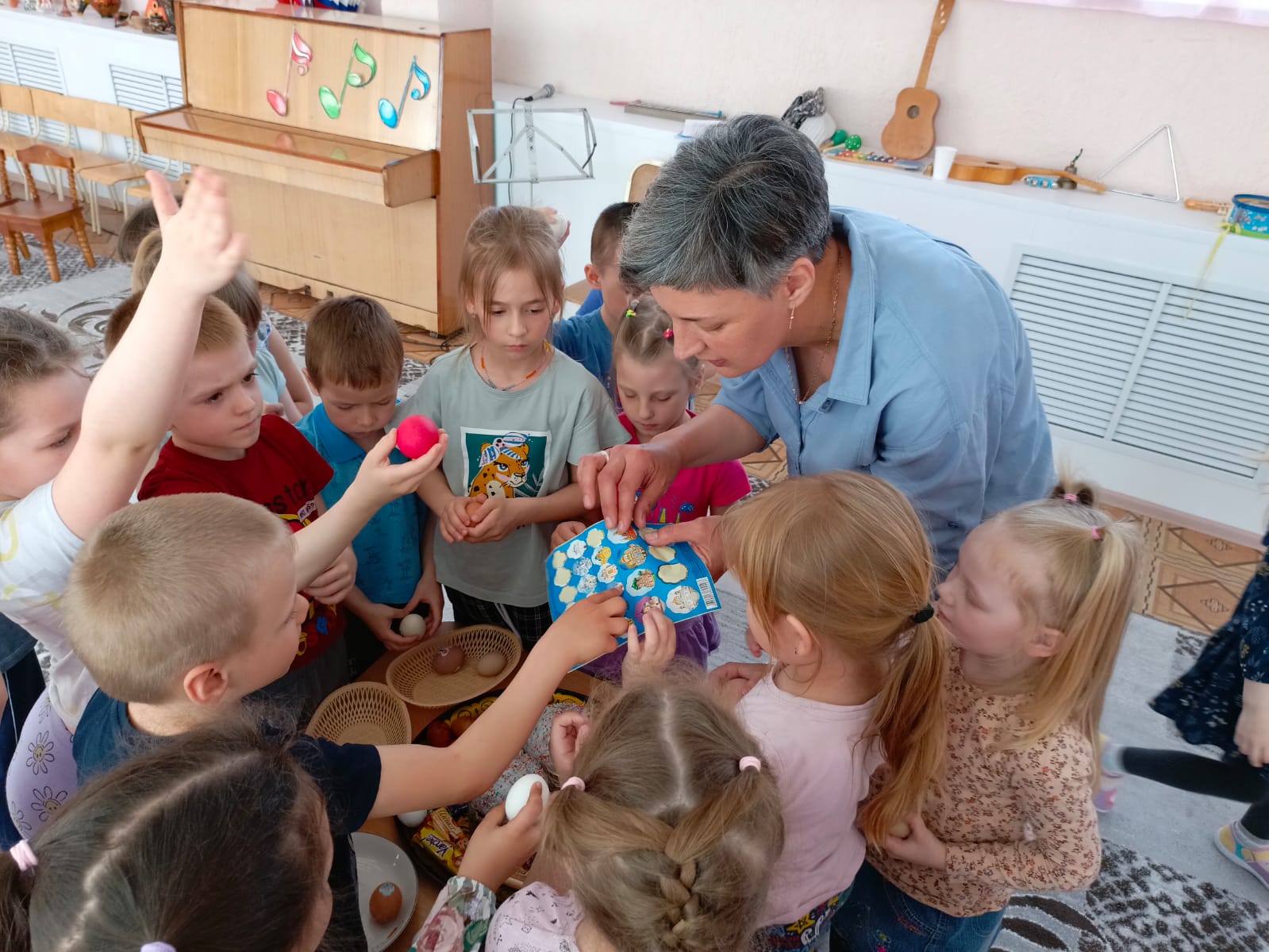 В целях приобщения дошкольников к народной культуре, посредствам формирования интереса к традициям православного праздника «Пасха. Светлое Христово Воскресение» в детском саду прошло красивое мероприятие «Встречаем Пасху». Дети познакомились с историей праздника, с его символами, с обычаями празднования, отгадывали загадки, играли в русские народные игры: « Из руки в руку», «Раскрути яйцо», «Пасхальный танец» , «Раскрась яйцо». Ребята получили много положительных эмоций. В заключении праздника всех поздравили с праздником Пасхи , с пожеланиями: «Пусть Ваши сердца наполняются любовью, пусть милосердны будут к вам Ваши близкие, пусть дела каждого дня будут только добрыми».